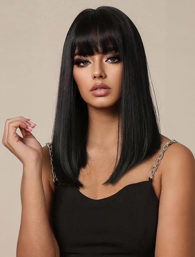 Home > Medium-length Straight Hair Fully Machined Bangs Wig 14 Inches Natural Black Heat-resistant Fiber High Temperature Silk Wig Dyeable And Permable